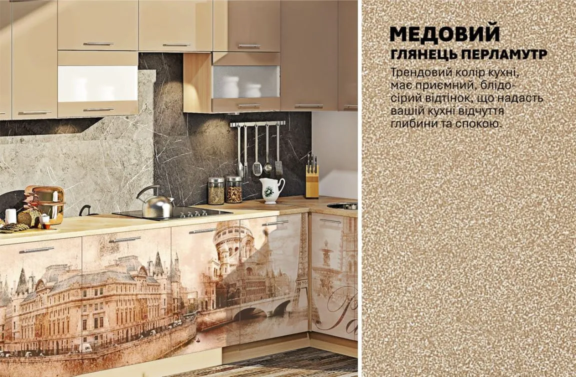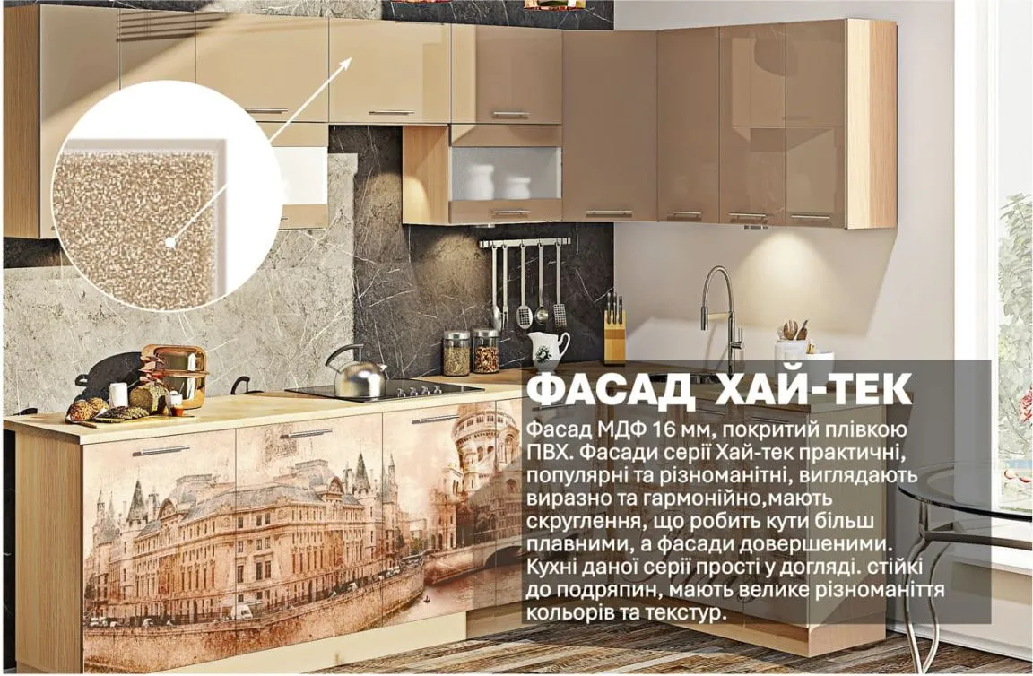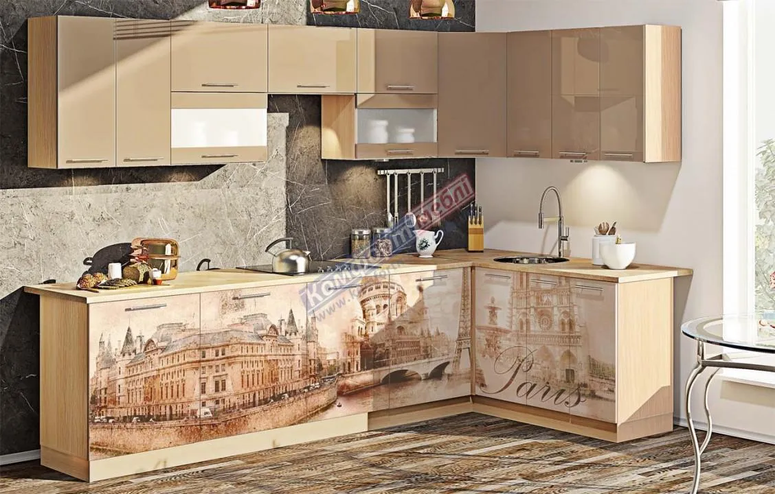 Модульная кухня Хай-тек с цветной печатью 3 х 1.7м угловая Капучино