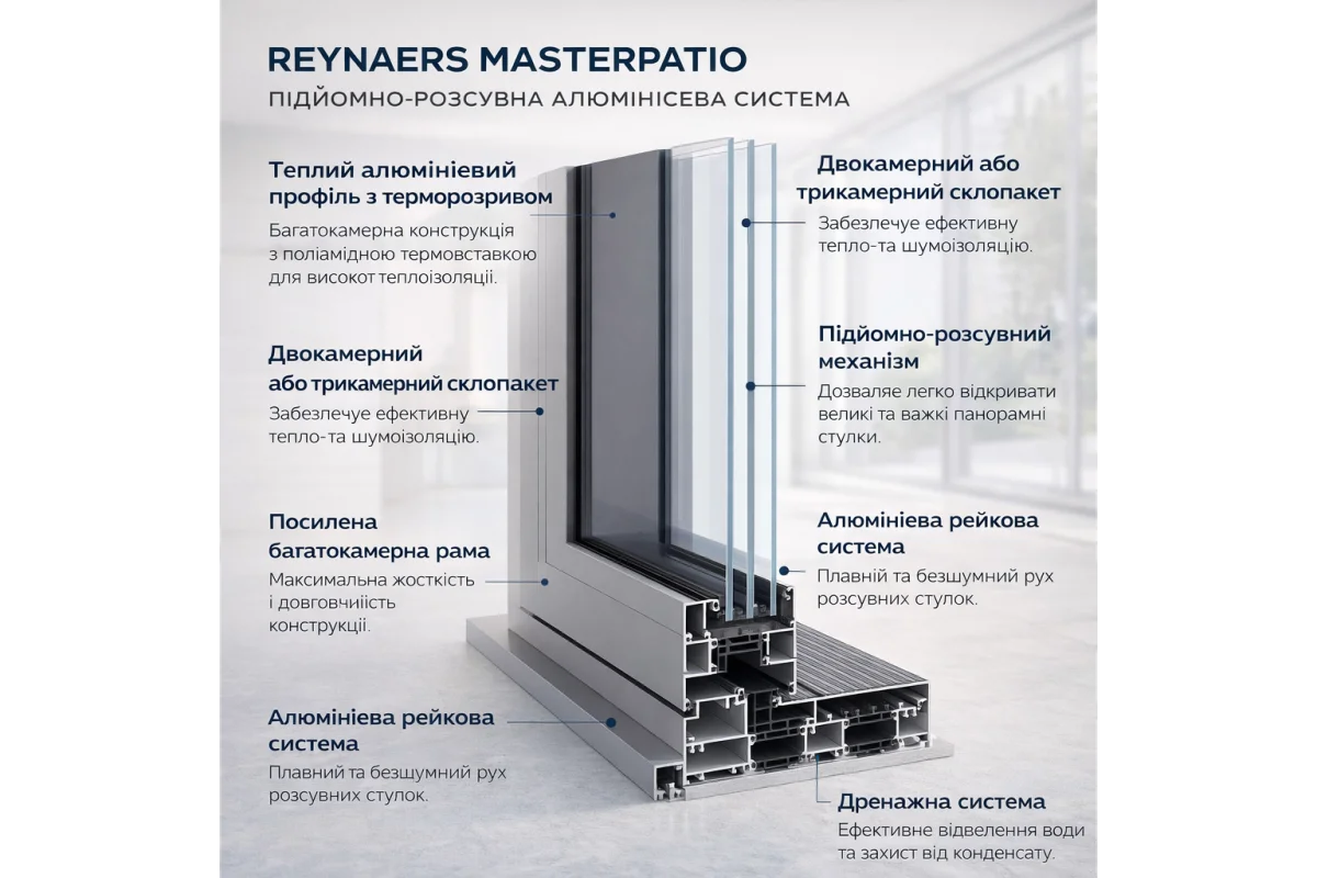 Алюмінієва підйомно розсувна система Reynaers MasterPatio з теплоізоляцією 3000*2300 мм