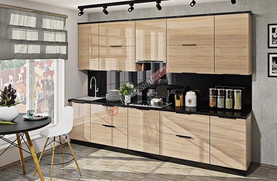Готова кухня Комфорт Фарбований високий глянець 3,2 метра Дуб натуральний