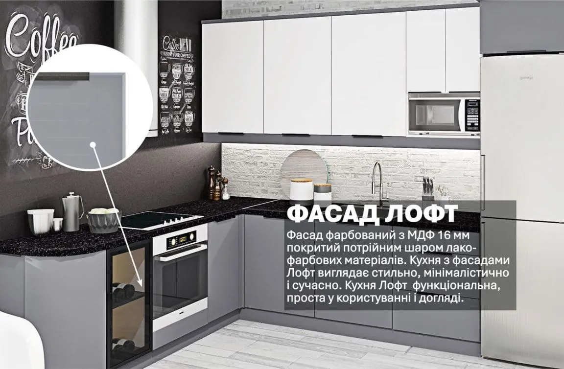 Готова кухня Комфорт Лофт 300 х 230см кутова фарбований МДФ Білий, Титан