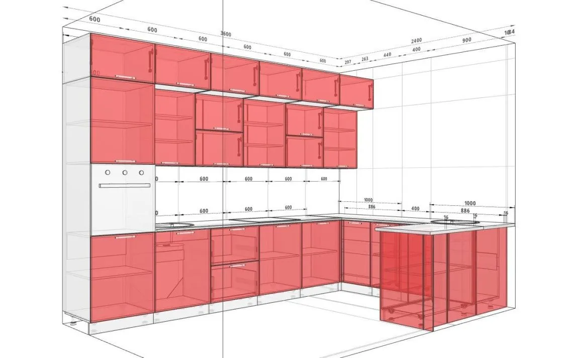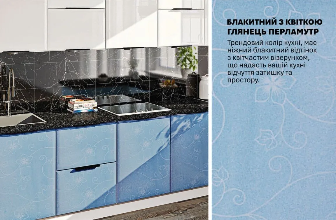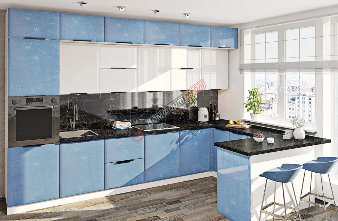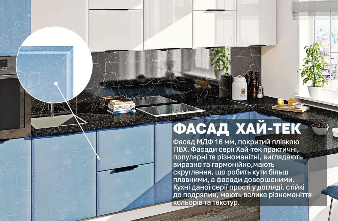 Модульна кухня Хай-тек 3,6х2,4м П-подібна Білий, Голубий