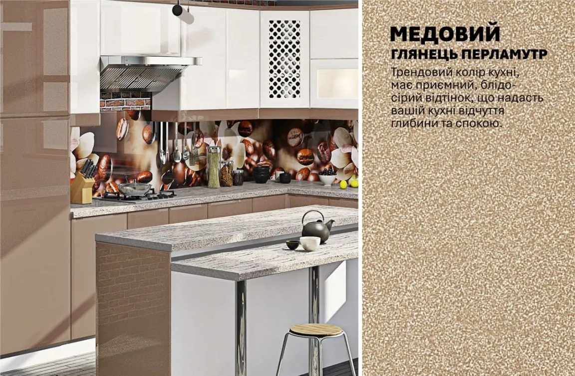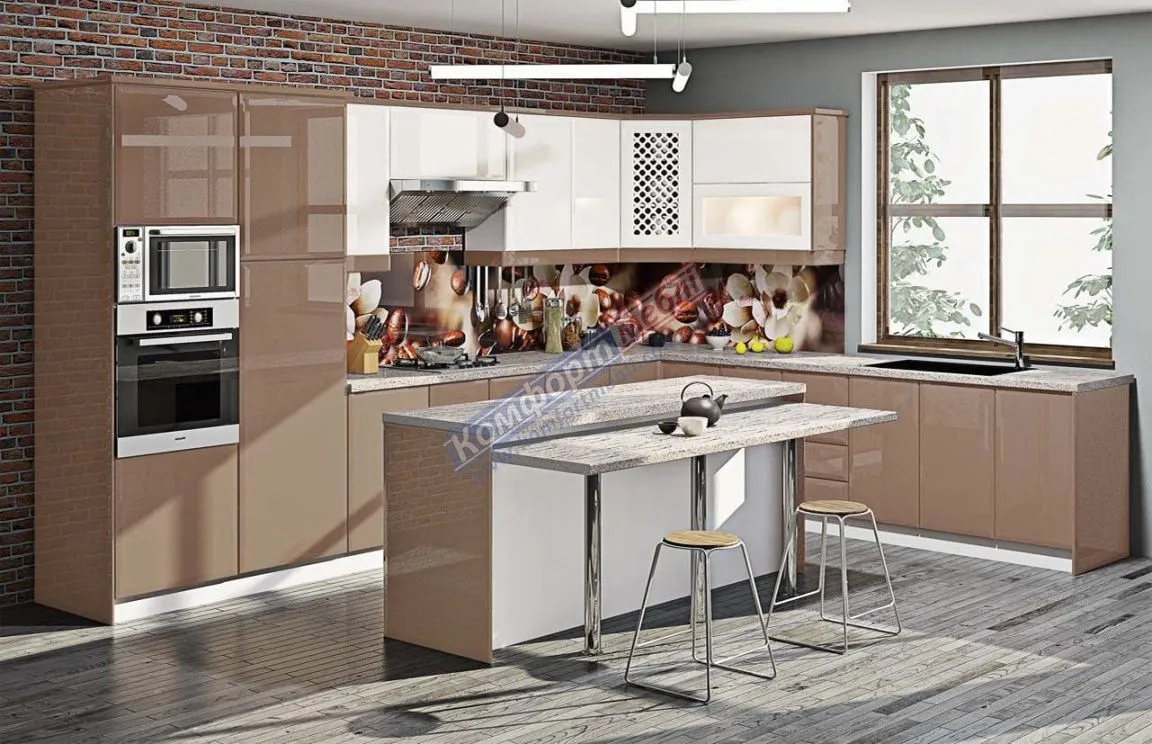 Модульна кухня Хай-тек 4,05х3,05м з островом Білий, Медовий