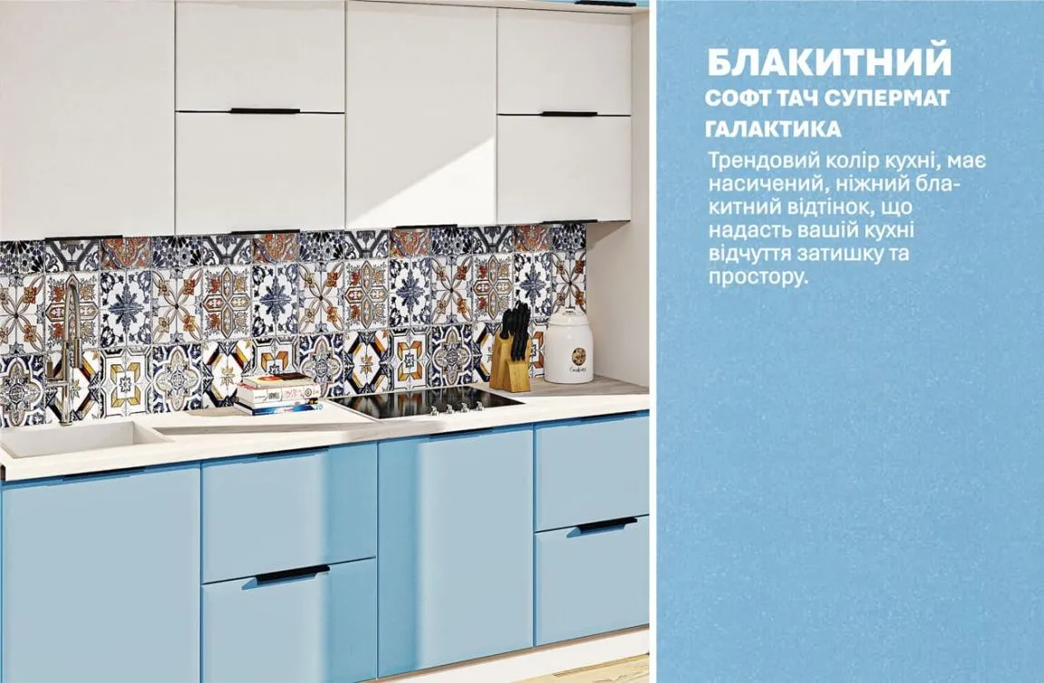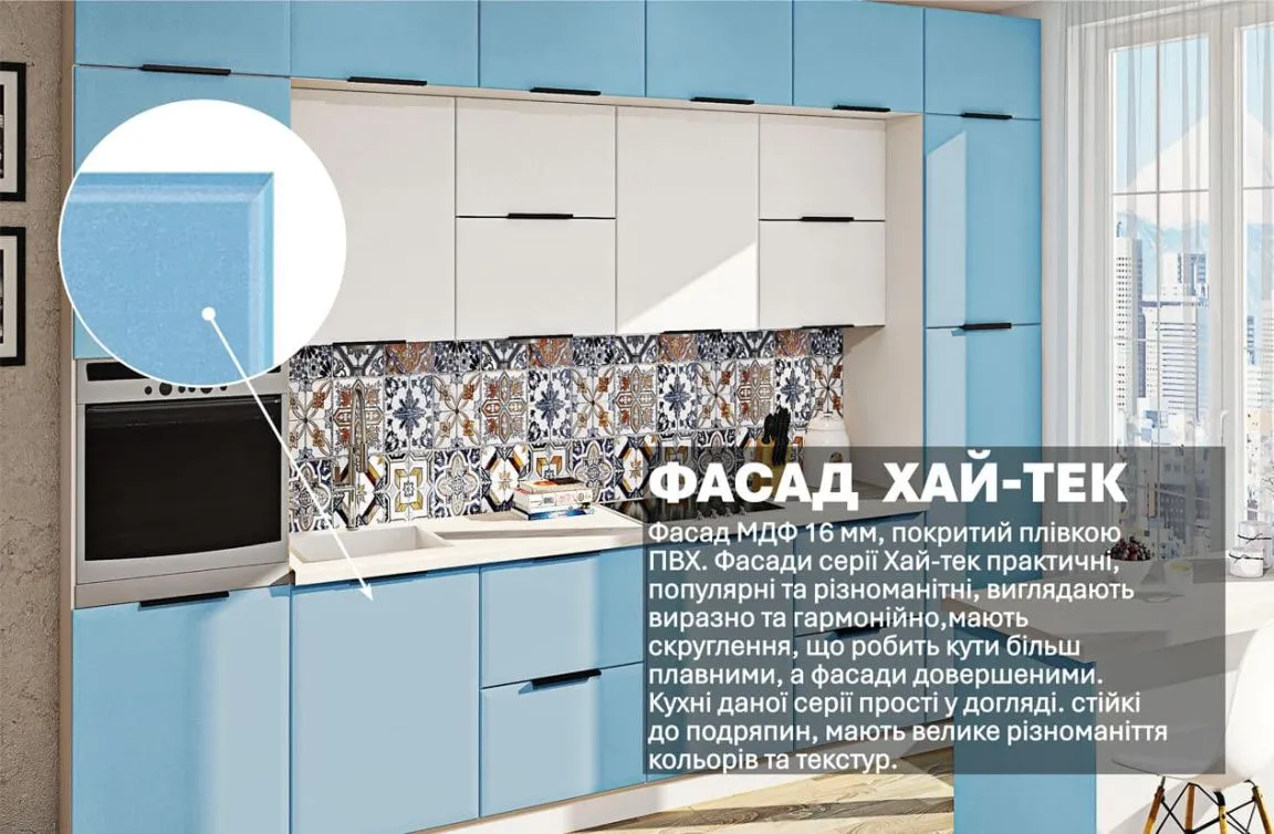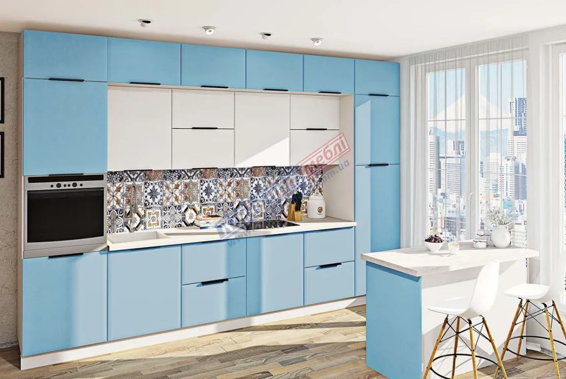 Модульна кухня Хай-тек софт-тач супермат 3,6м з кухонним островом Білий, Голубий