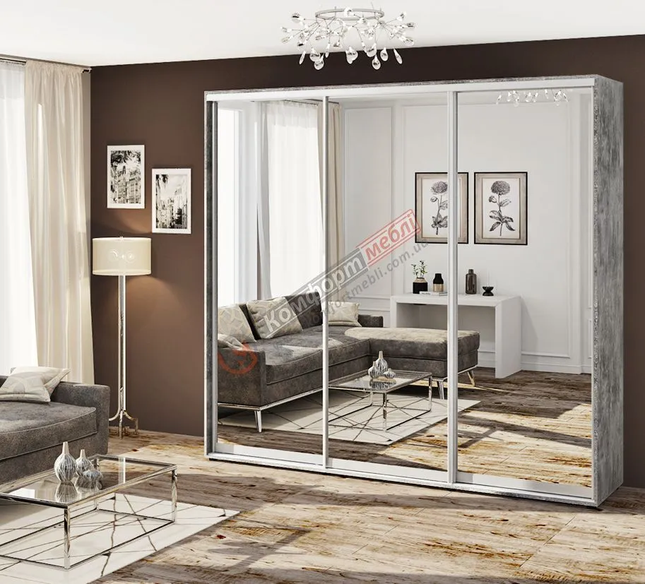 Шафа-купе 2,5 м Комфорт "Дзеркало" 3х дверна бетон світлий