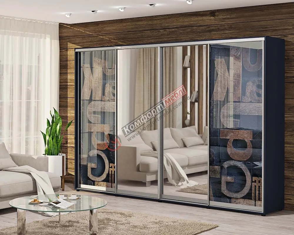 Шафа-купе 2,8 м Комфорт "Скло фотодрук" з дзеркалом 4 дверна темна