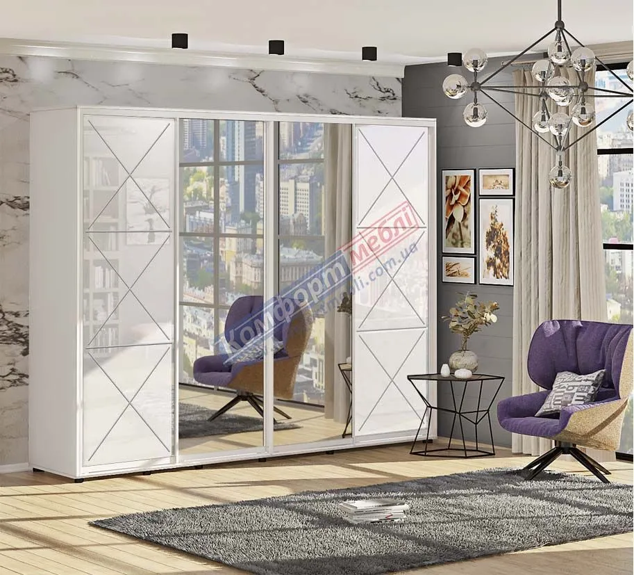 Шафа купе 3.4 м Комфорт "Прованс" глянець з дзеркалом 4 дверна біла