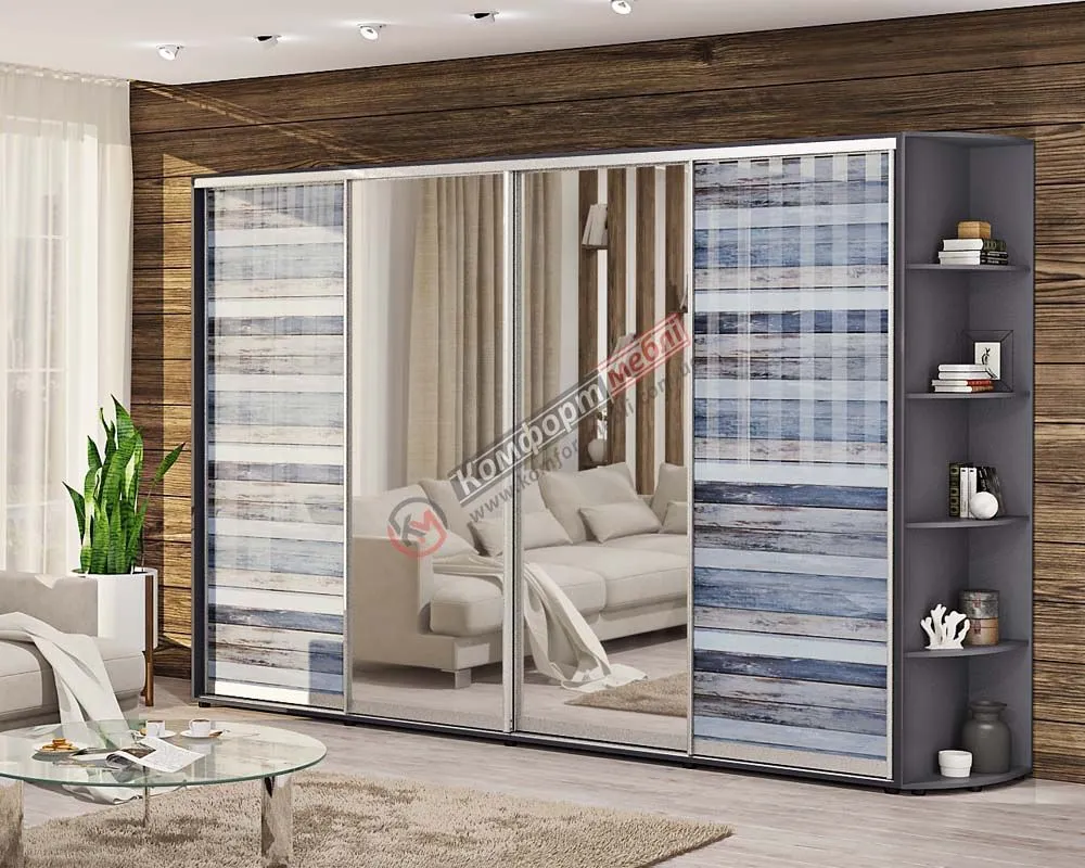 Шафа купе 3.8 м Комфорт "Скло фотодрук" з дзеркалом чотирьохдверна графіт