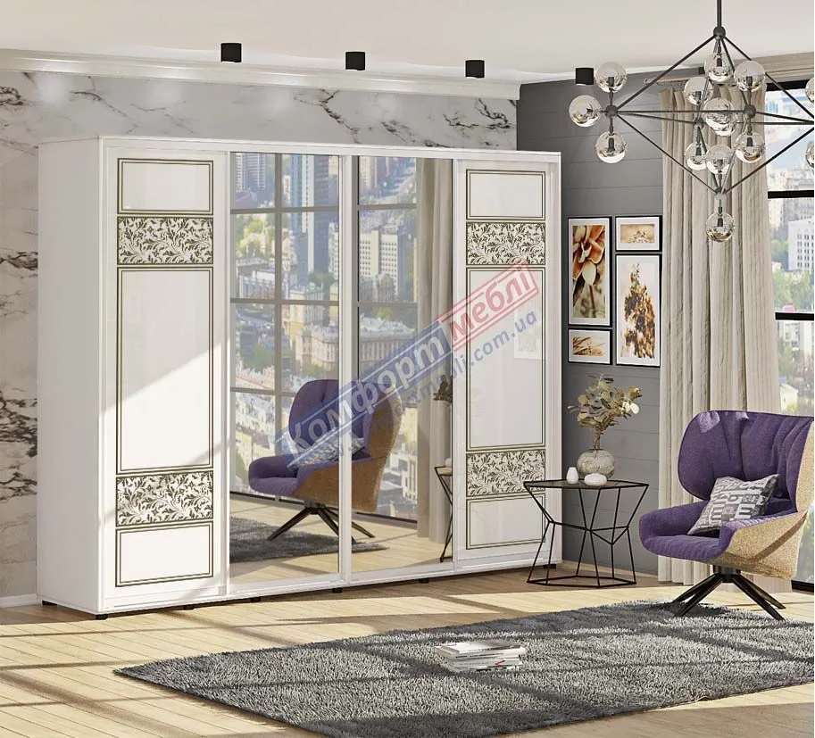 Шафа-купе 3 м Комфорт "Валенсія" глянець з дзеркалом 4 дверна біла