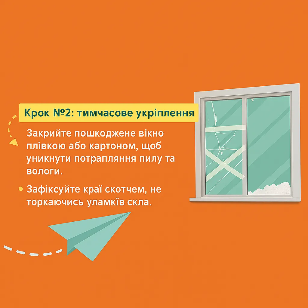 - Тимчасове закриття вікон фанерою або плівкою, поки не буде організовано постійний ремонт.